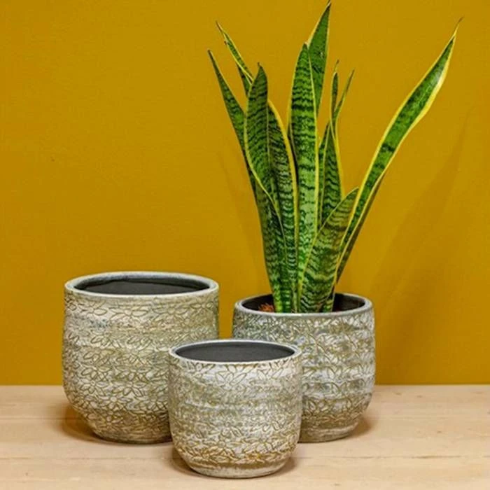 Le pot Liset ocre a une belle apparence. La couleur et la texture du pot crĂ©ent un accessoire moderne pour vos plantes d’intĂ©rieur.